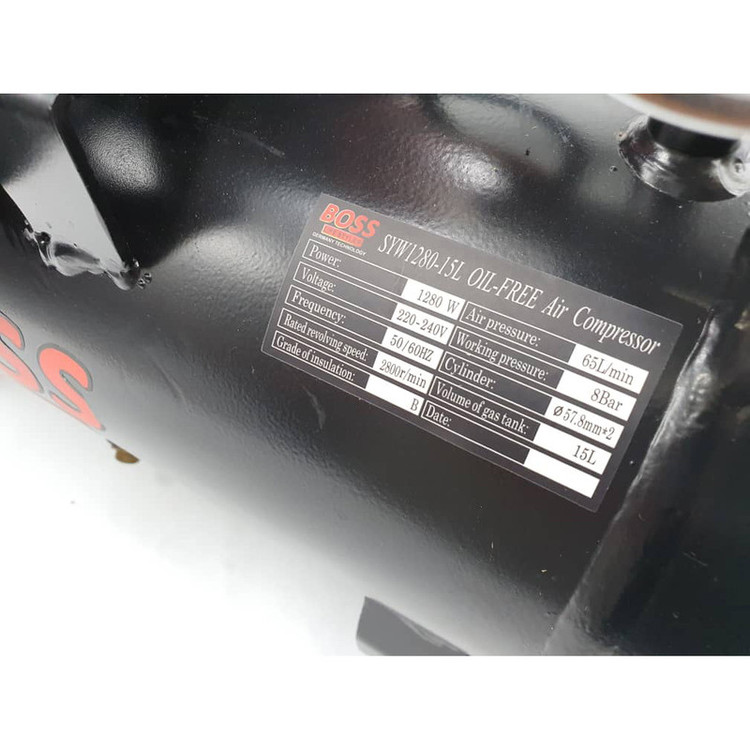 کمپرسور هوا 15 لیتری باس boss دارای تک موتور سایلنت است.فشار باد کمپرسور 8 بار میباشد میزان هوادهی در دقیقه 65 لیتر میباشد و دور موتور 2800 دور دقیقه است . 1280 وات می باشد تک موتور است دو سیلندر می باشد خروجی کوپلینگ دارد همچنین وزن 12 کیلوگرم دارد میزان صدا 70 دسی بل بوده و سیمپیچ مس است و نیز مجهز به سیستم لرزه گیر می باشد مخزن سخت کاری شده جهت جلوگیری از پوسیدگی و 1 عدد فیلتر هوا دارد و کیفیت بسیار عالی دارد.همچنین دارای شیر فشار اطمینان می باشد